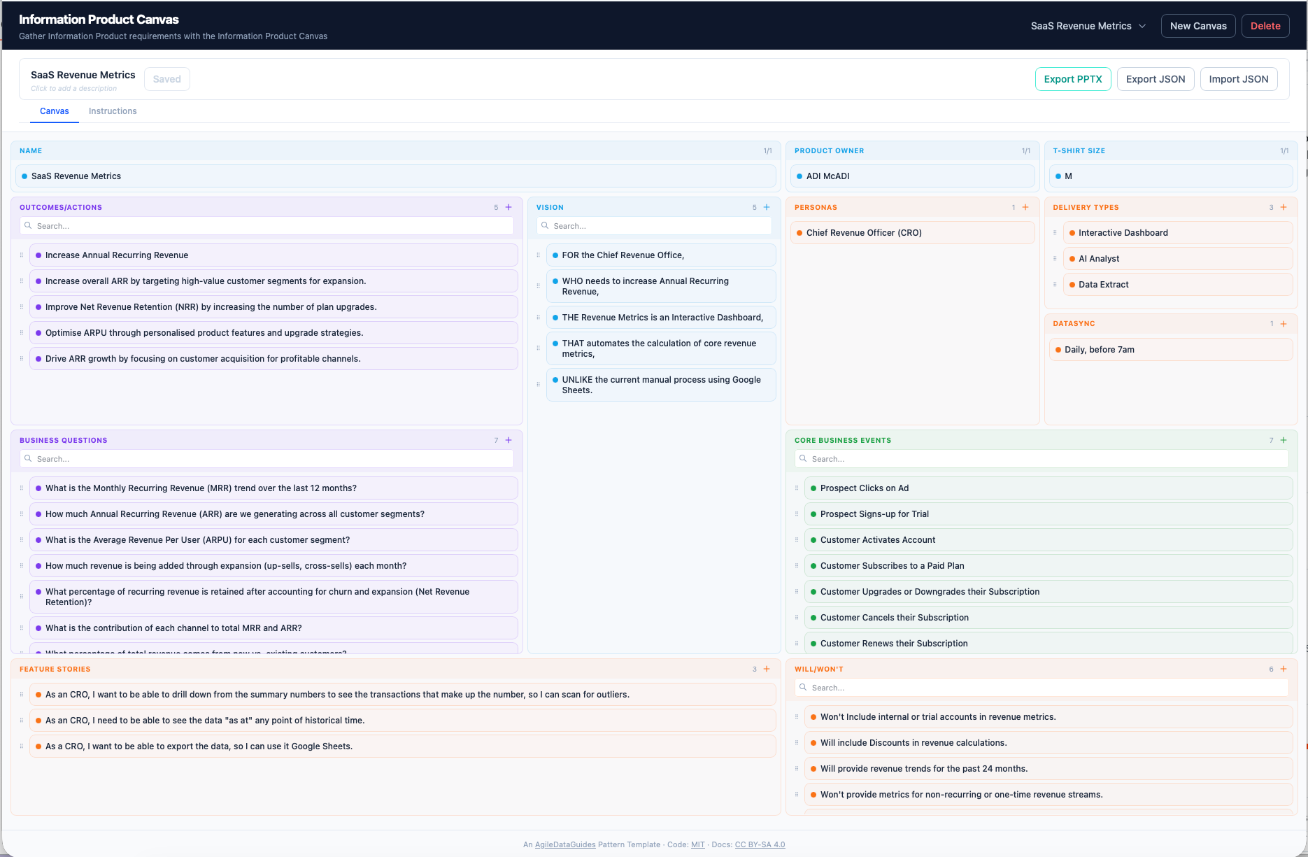 Each canvas has all 12 areas: Business Questions, Outcomes and Actions, Personas, Vision, Delivery Types, Data Sync, Core Business Events, Feature Stories, Will/Won’t, the Information Product Name, Product Owner, and T-Shirt Size.